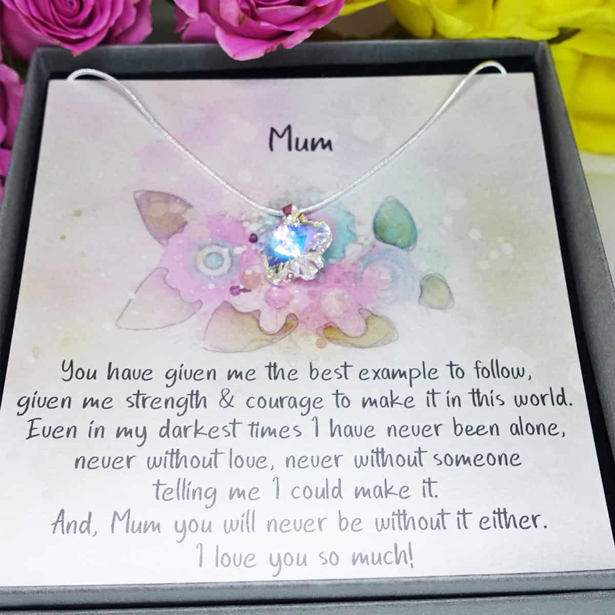 This stunning crystal pendant necklace shows your mum how much she means to you. Designed with a delicate floral charm that sparkles with every movement, this keepsake is as radiant as the love she has always shown you. Paired with a deeply meaningful message card, it’s a tribute to her strength, wisdom, and unwavering support through every moment of life.
