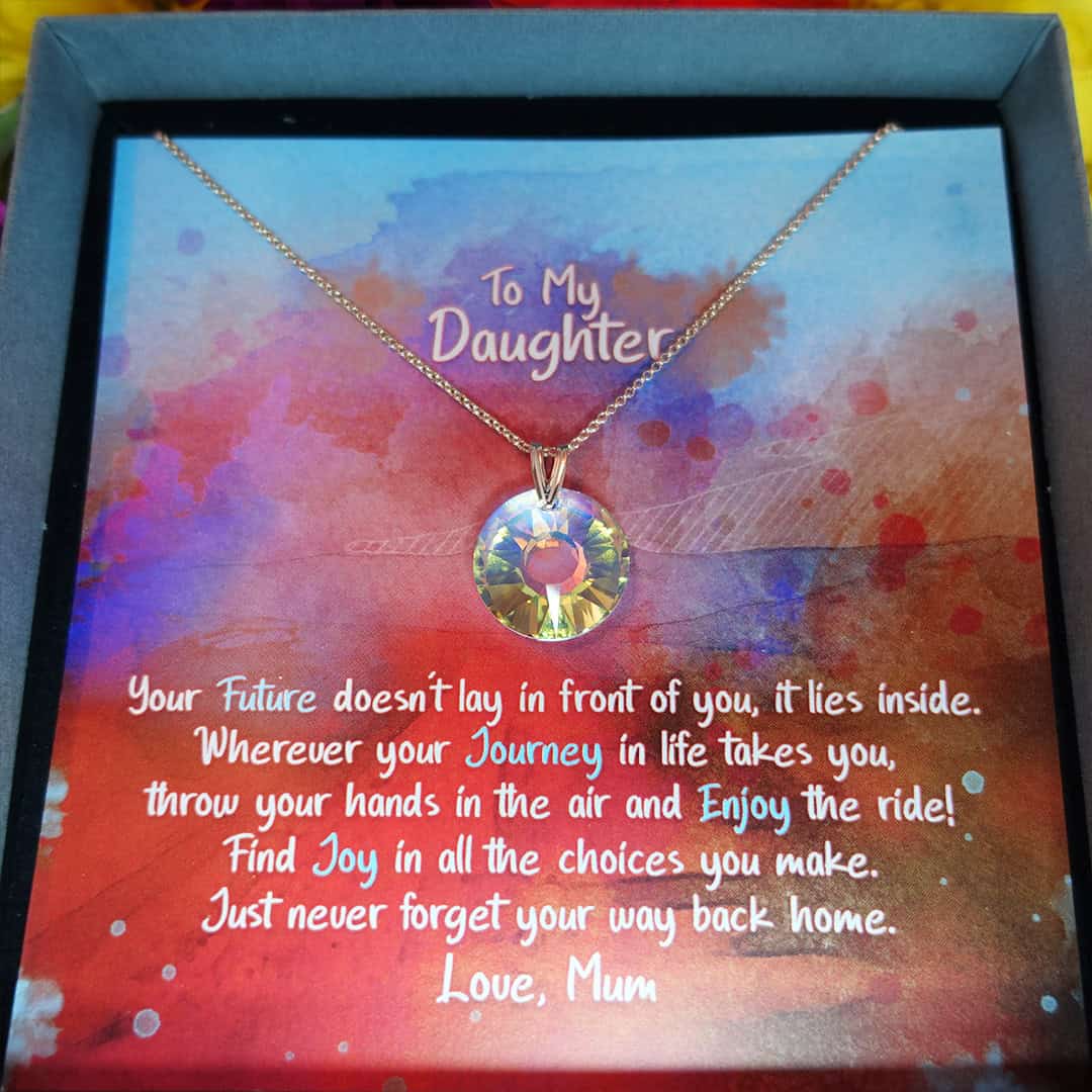 Celebrate your daughter’s unique journey with this stunning crystal pendant necklace. It symbolizes inner strength, joy, and the beauty of life’s adventures. The radiant circular design reflects her limitless potential and the love that will always guide her home.
